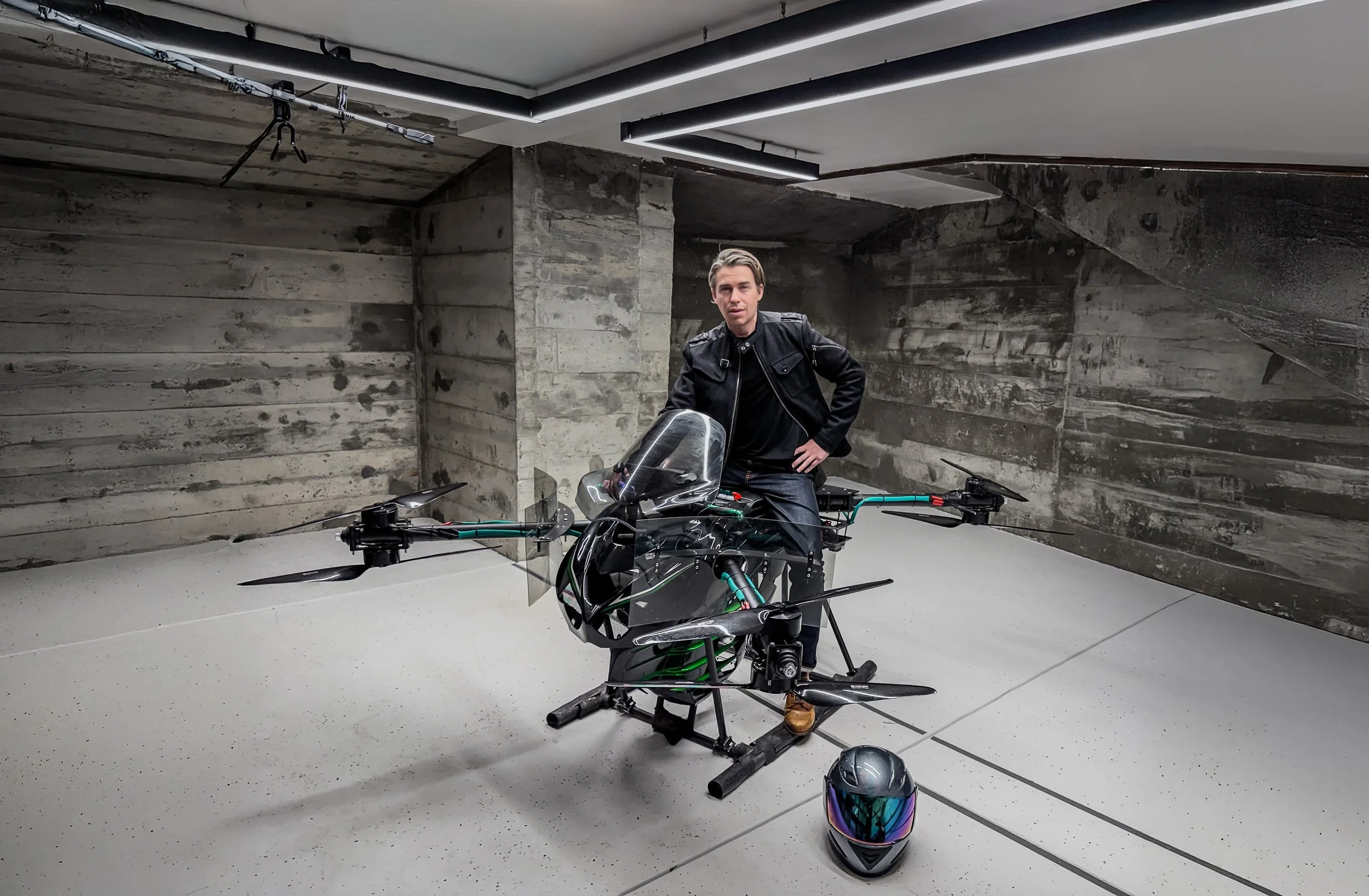 Human-rideable motorcycle drone. 60kW, 8 propellers, onboard avionics, 8 minutes runtime. Max airspeed 35 mph. Custom carbon fiber frame. Autopilot software built on Ardupilot stack, with custom vision and LIDAR software to hold position and height.
