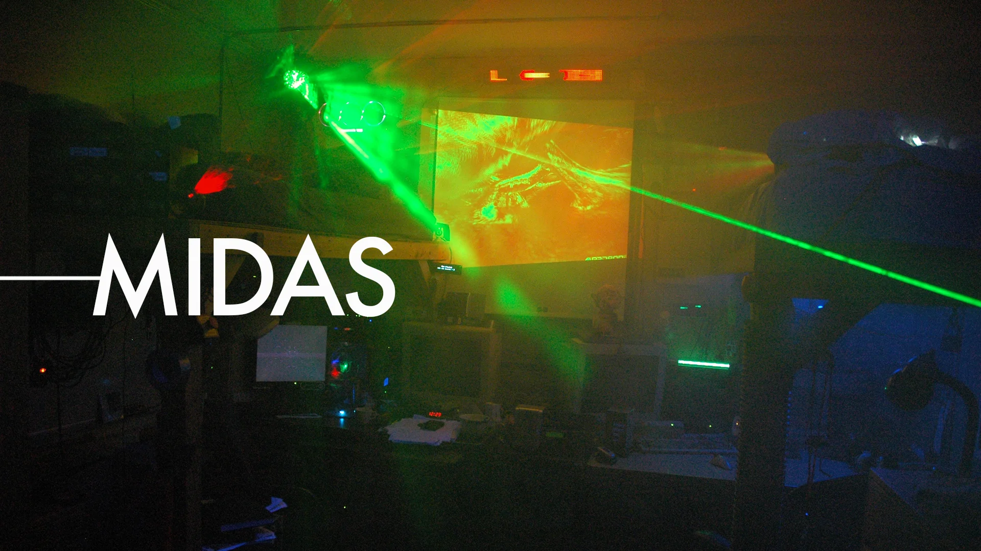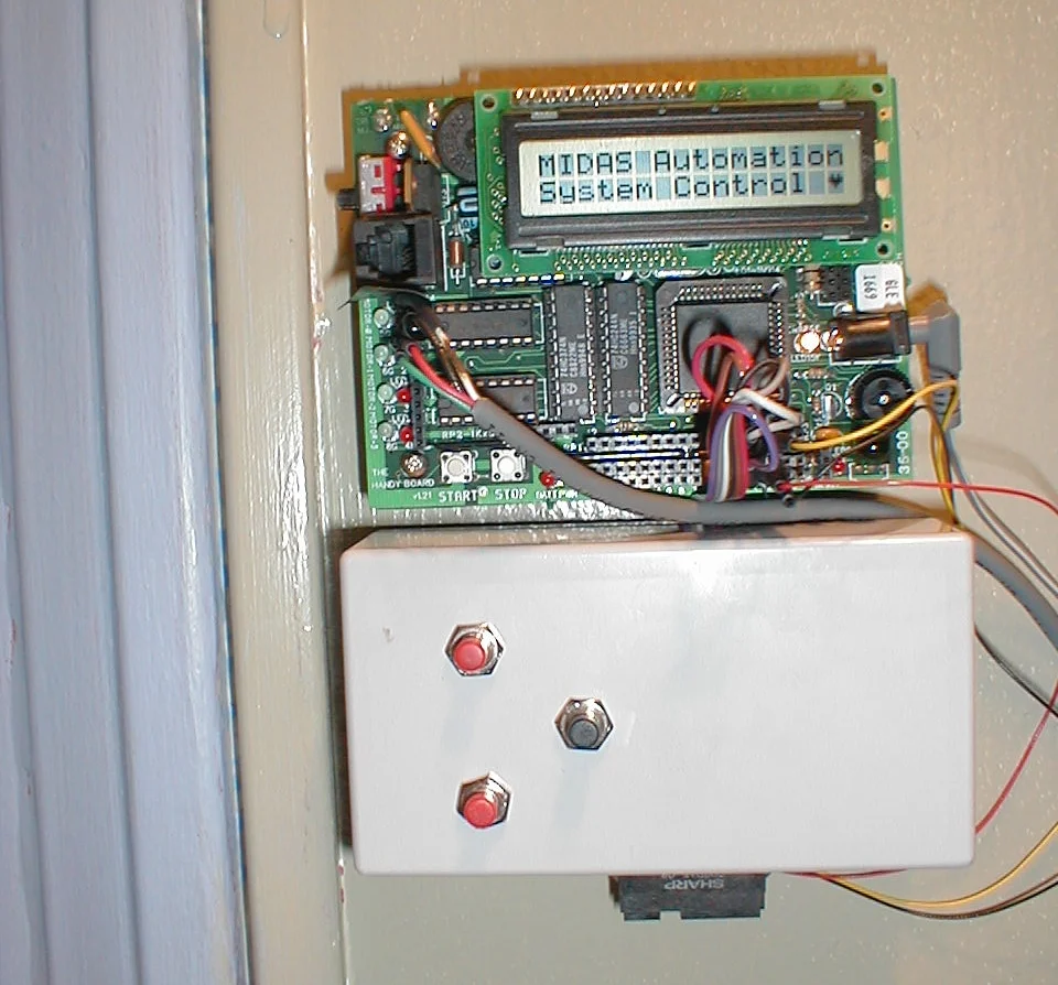 Made out of an old relay box from laboratory equipment, this custom-designed control pod hooks up to one of MIDAS's USB ports and controls a number of system features. Three of the buttons on it activate preset "modes". One activates sleep mode, which turns off all the lights and cues sleep music, another activates work mode, which turns on all the standard lights and cues study-appropriate music. The third button initiates a relax mode which turns off all the lights except the ambient colored lights. In addition, the blinds are shut and relaxing music plays from the speakers. "Romance" mode came in version 2.0.