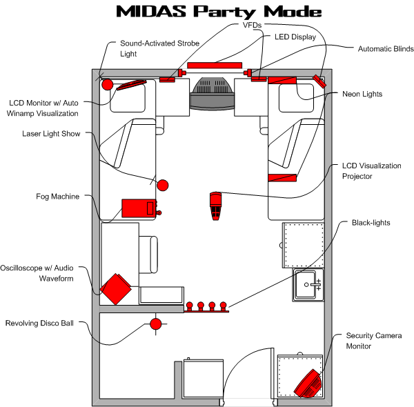 Below is a flattened schematic of the dorm room with all Party Mode devices highlighted in red.