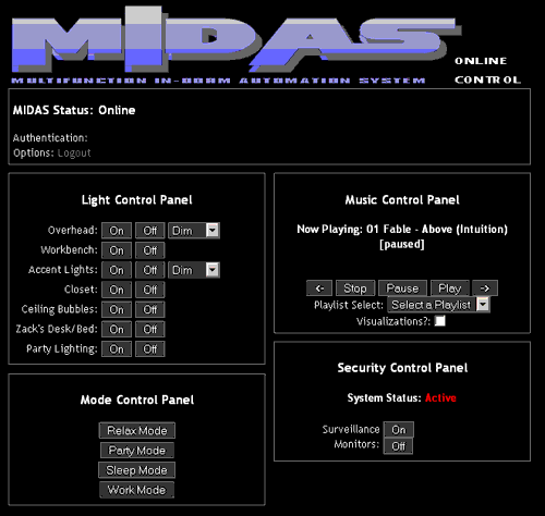MIDAS Web Control Panel: Controls lights, modes, music, and security of the MIDAS system.