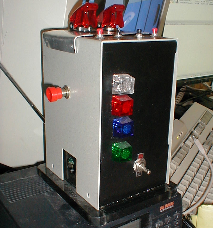 The two rocker switches on top control power to the VFDs and the room security cameras. The indicator lamps display the status of the alarm system, MIDAS power, and the security camera power.